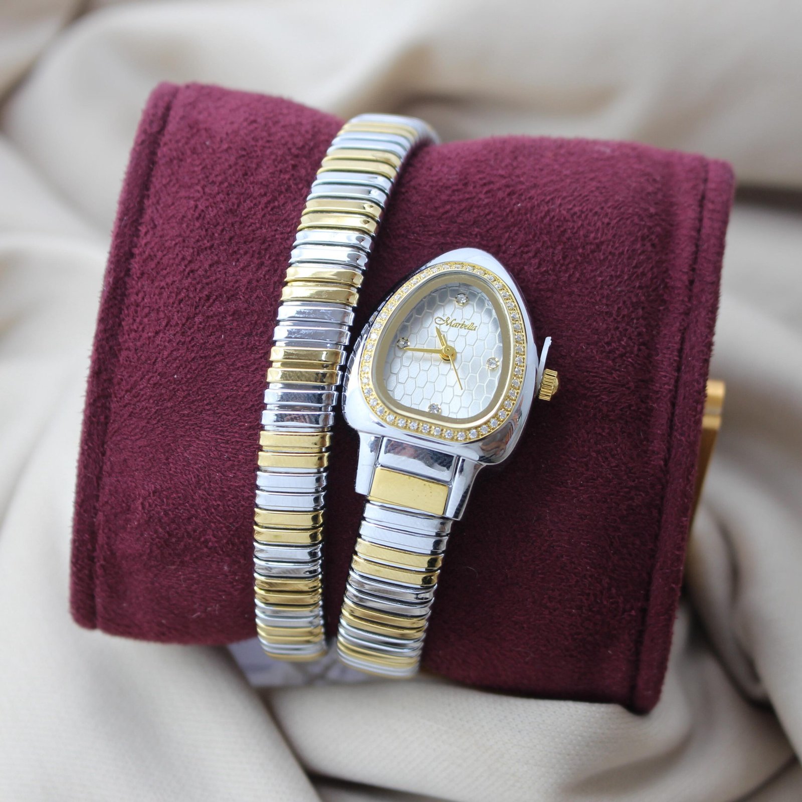 ساعة ماربلينو نسائية ستيل تصميم ثعبان مرصعة بدقة الالماس – إصدار حصري (مكس بخلفية جلد ثعبان)