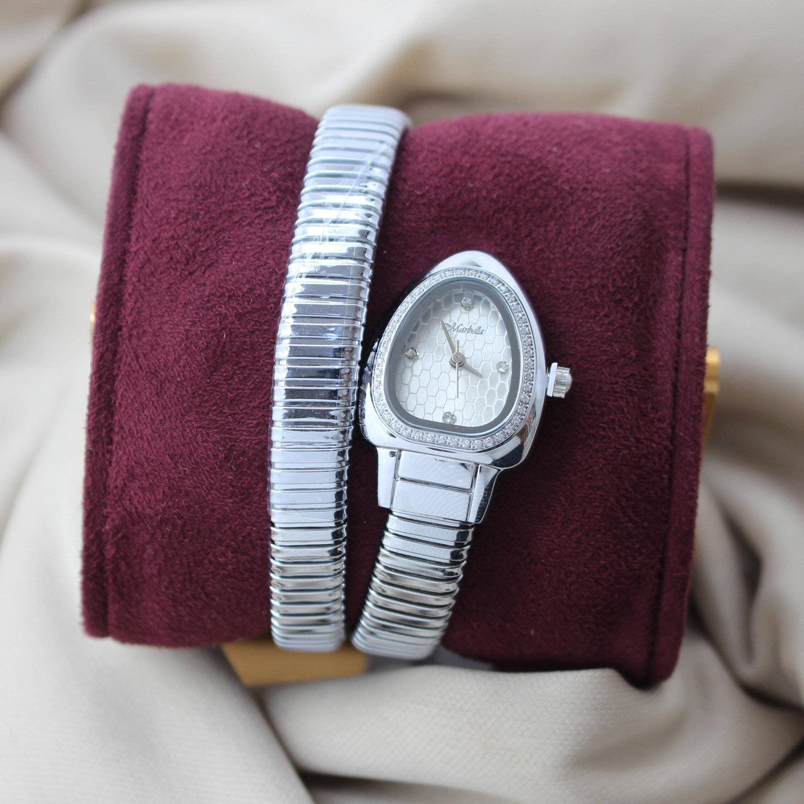 ساعة ماربلينو نسائية ستيل تصميم ثعبان مرصعة بدقة الالماس – إصدار حصري (فضي بخلفية جلد ثعبان)