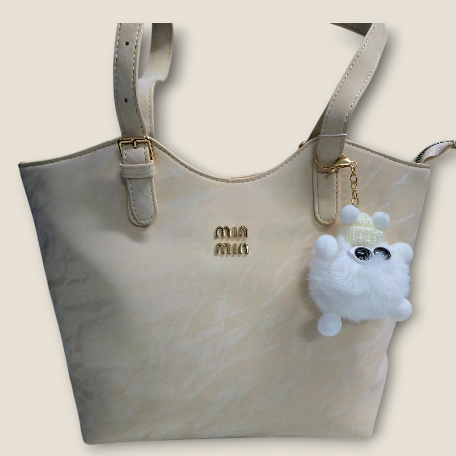 شنطة نسائية بديلة ميو ميو Mi Miu – بلون بيج متوهج مع إكسسوار فرو جميل قابل للازالة
